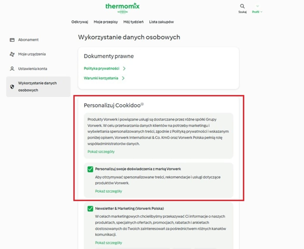 ● Strona internetowa: Otwórz Cookidoo® > Twoje Imię (w prawnym górnym rogu) > Konto użytkownika > Wykorzystanie danych osobowych > Personalizuj Cookidoo® > Włącz opcję: Personalizuj swoje doświadczenia z marką Vorwerk
