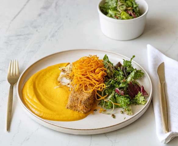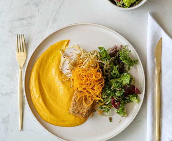 Tofu w stylu japońskim, sos dyniowy, spiralizowane frytki